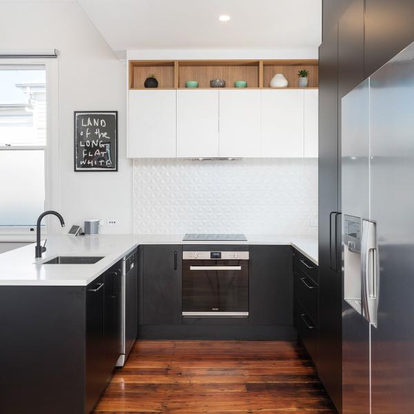 Shape : U-shaped matte white and black flat-panel lacquer kitchen cabinet